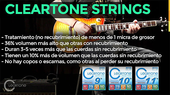 Cleartone Strings, fabricadas en Burbank, CA - USA, son la ¨joya de la corona¨ para los guitarristas que las han encontrado. Con gran fama en USA y Europa, y una gran aceptación de fabricantes y músicos por su Tratamiento que garantiza mayor duración de la cuerda, un volumen más alto y como dice su slogan, un tono sin compromisos.