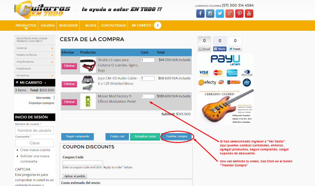Compra en nuestra tienda online Guitarras EN TODO y paga en efectivo desde toda Colombia, NO necesitas cuenta bancaria ni Tarjeta de Crédito !!