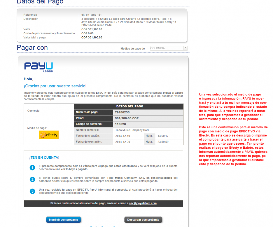 Ya has seleccionado el método de pago e ingresado tu información, PAYU te mostrará y enviará a tu e-mail la información de tu compra indicando el estado de la misma. A la vez nos reportará a nosotros para que iniciemos a gestionar el alistamiento y despacho de tu pedido. si el pago es en Efectivo generará un recibo con el que debes pagar en los puntos de Efecty o Baloto.