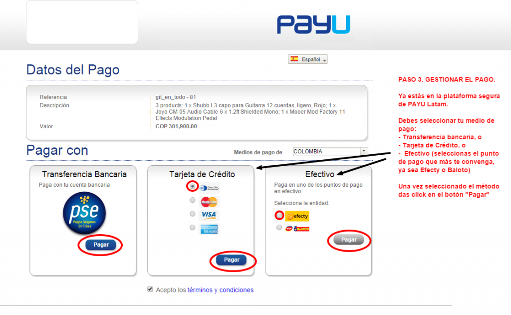 Ya has seleccionado el método de pago e ingresado tu información, PAYU te mostrará y enviará a tu e-mail la información de tu compra indicando el estado de la misma. A la vez nos reportará a nosotros para que iniciemos a gestionar el alistamiento y despacho de tu pedido. si el pago es en Efectivo generará un recibo con el que debes pagar en los puntos de Efecty o Baloto.